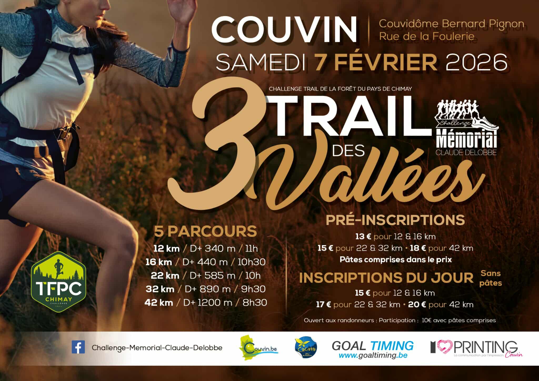Couvidôme Rue de la Foulerie, Couvin, Belgium12km : D+340m : 11h 16km : D+440m : 10h30 22km : D+585m : 10h 32km : D+890m : 9h30 42km : D+1200m : 8h30